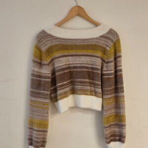 Sunday Best sweater Aritzia, fuzzy knit cropped sweater, striped v-neck sweater, cozy fall outfit, women’s brown cream yellow sweater, soft fuzzy knit top, Aritzia Sunday Best medium, trendy cropped knitwear, cozy winter fashion.