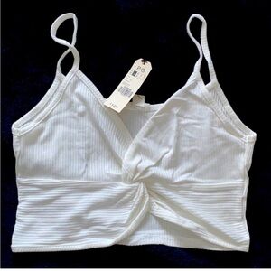 - cream crop tank top featuring twist front. From Garage
