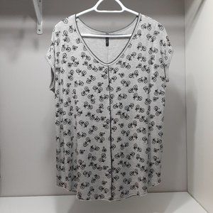 Casual pull-on v-neck grey top with black bicycle design. Black detail around v-neck and down middle of front and back of top. Small slit up back of top. Soft rayon/spandex blend. Washes up beautifully. Size M. Like new condition - only worn a couple of times.