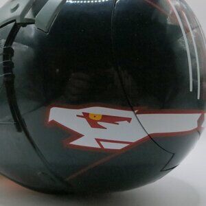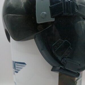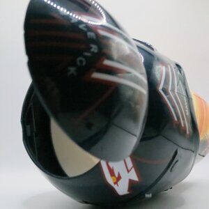 This Cineplex collectible popcorn container for the movieTop Gun: Maverick. It has a Maverick helmet-shaped lid attached to a standard plastic popcorn bucket base. The top of the helmet lifts open to access the popcorn.