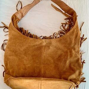 This is a super fun fringe bag! It is genuine leather and a natural tan colour.