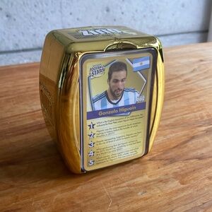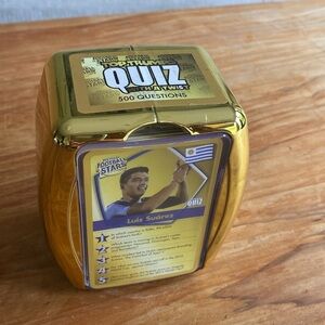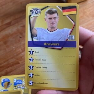 Perfect for the footy / soccer fans! Considering how much my son and his friends have played this it is still in great condition. No flaws to note, box works perfectly, cards are still in good shape etc. If your family loves soccer this is a fun game to have in the car on long road trips. I love a game where the kids are enjoying it and not even realizing they’re learning. Feel free to message if you have any questions about the item.