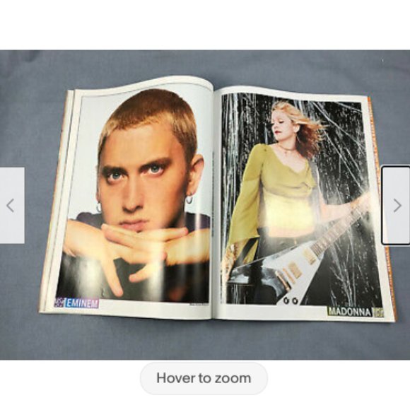 Top of the Pops Magazine #71 January 2001 issue. Eminem cover issue, includes 8 1/2" x 11" posters for Eminem, Madonna, Destiny's Child, Christina Aguillera, Robbie Williams and "poster mag" for the Steps (poster mag is still attached to magazine). Does not include any other extras/promo items. Magazine is 82 pages, 8 1/2 x 11". Pre-owned magazine has creasing/bends, clipping removed from page 27/28, scrape at spine edge, wear to page edges.