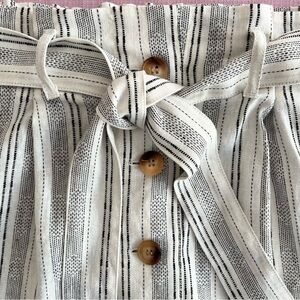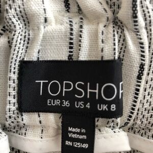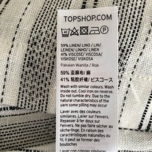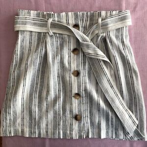 Small paperbag waist mini skirt by Topshop. Gorgeous Linen coloured with black vertical stripes quality woven fabric. Front buttons are functional and will open. Linen Viscose fabric. Excellent condition.