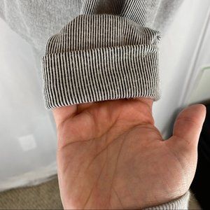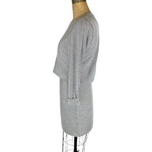 Size US 2. Pinstripe light grey/black. Rounded neck. 3/4 sleeve with folded cuff. Layered upper body, kite open back. Fitted bodice. Fabric has a bit of stretch.