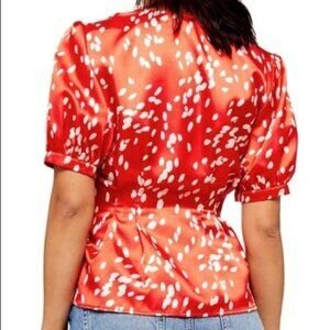 TopShop red white Dalmatian dotted satin peplum balloon sleeve blouse size 2