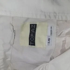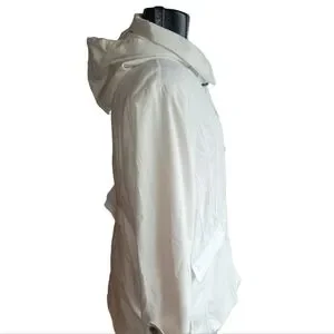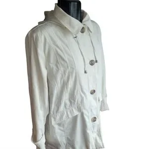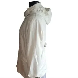 Topaz white lightweight jacket. Has 4 button front closure and a drawstring removable hood. Also has 2 front flap style pockets.
