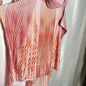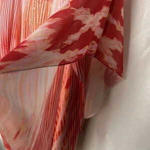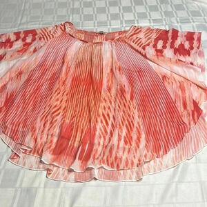 Beautiful flare , wide , flowy , super light , feminine top layer with printed abstract design of red, light orange white pale tan , pinks colors . Feel like sunny. Fun , boho. Bohemian type vibe . Beachy , vacation , Barbie or retro vibe
