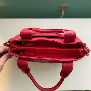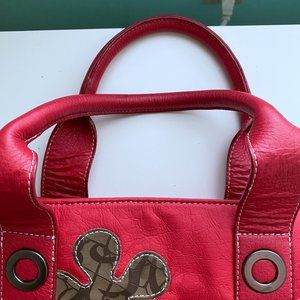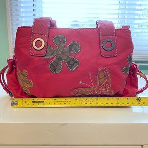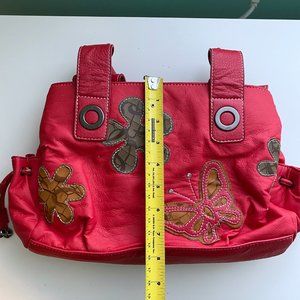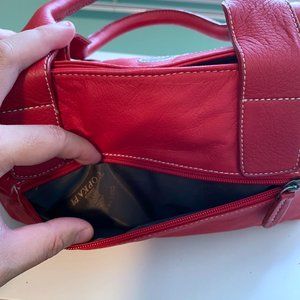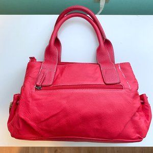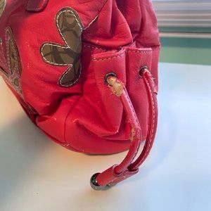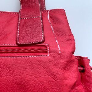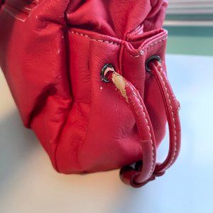 Faux leather handbag with one exterior zip pocket and two small drawstring side pockets.