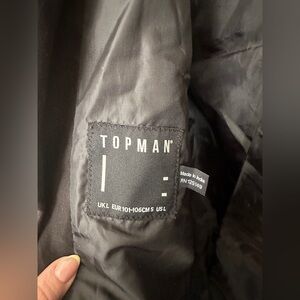 This Topman jacket offers a sleek and casual design, perfect for everyday wear. Crafted in a solid black color, it features a collared neckline and a full-length zipper for a modern look. Its lightweight construction makes it ideal for layering in transitional weather.