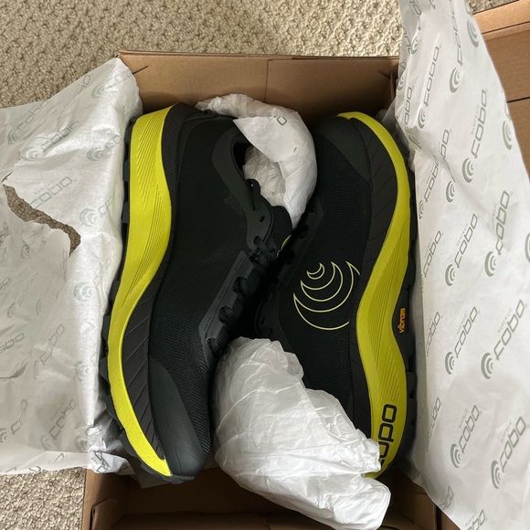 Brand new still in the box, great trail, racing shoe - 5 mm drop, super sticky Vibram soles, wide toe box. Great for the long haul.