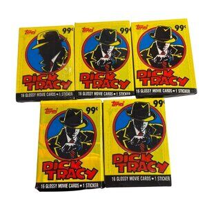 A nostalgic collectible set featuring five packs of Dick Tracy movie cards by Topps. Each pack contains 16 glossy cards plus one sticker, ideal for enthusiasts of vintage movie memorabilia or collectors of classic trading cards.