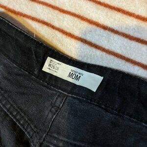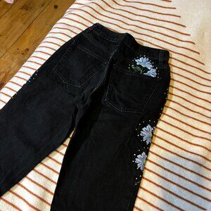 Flattering black mom jeans from Topshop. Blue flower on front and back outlined with sparkle rhinestones. Great condition.