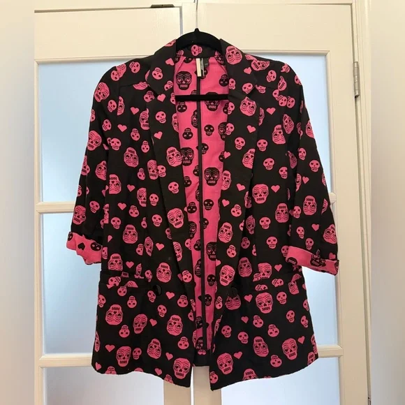 Bold blazer with pink skulls on black. Eye-catching and unique style.
