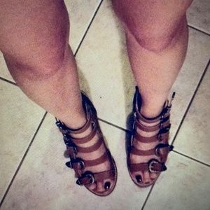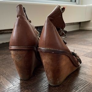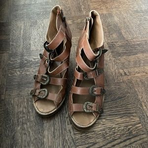 Stylish brown wedge heels. Features multiple buckle straps. Perfect for a chic look. See pictures for condition.