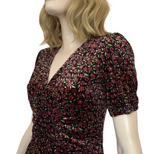 Features: Pretty floral motif on black, short sleeve, plunge V-neckline at front, pull on design, A-line silhouette, mini length, ruching at front and shoulders, flounce shirt, stretch fabric
