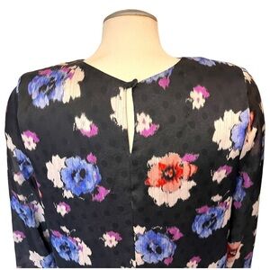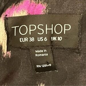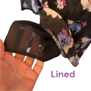 Sleek and modern Topshop floral dress on a black background is simple and sophisticated. Straight cut sheath style skims and flows over the body. Purple and blue exaggerated floral adorns the sheer overly a top a full, built in chemise. Hem in falls to above the knees in front and the knees in back.