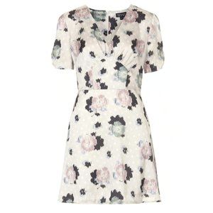 Topshop Floral Polka Dot Tea Dress Puff Ruched Sleeves V-Neck Slip Corset Summer