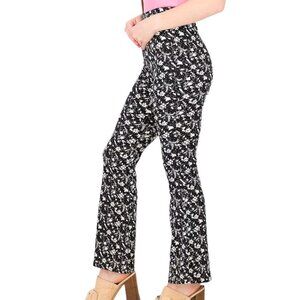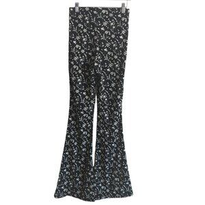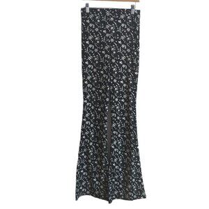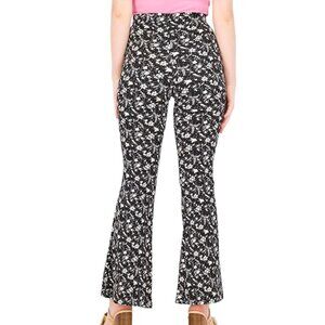 These are high waisted flared pants by TOPSHOP. It's made from a black crinkly stretch fabric with an allover white floral print.