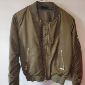 This green bomber jacket is from Topshop and is in good condition. It has been worn several times and is a size 4. It's made of 98% polyester and 2% elastane.