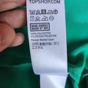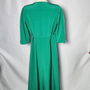 Silky feel long emerald green wrap dress by Topshop, with tie that secures through the side and a belt loop to maintain structure of dress while wearing. Beautiful drape. Small ruching detail at shoulder and dainty sleeve buttons give old Hollywood feel.