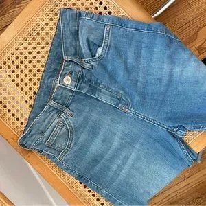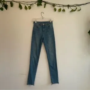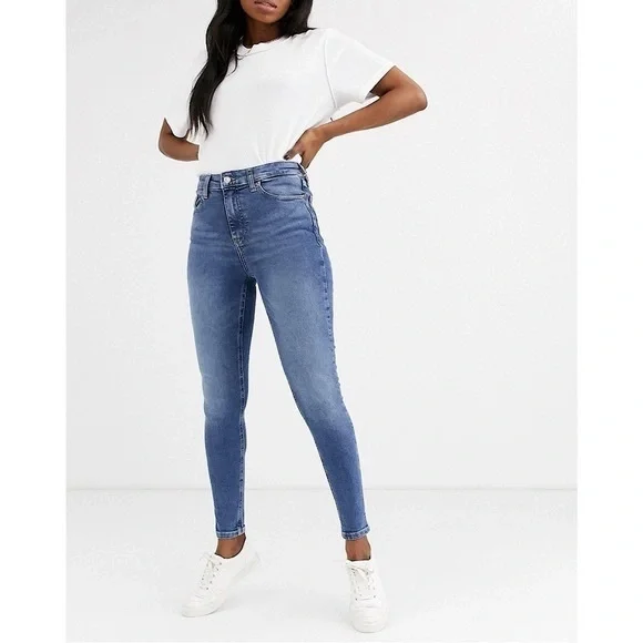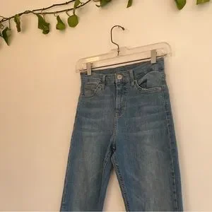 Light wash blue high waisted jeans from Topshop. Size 26” waist. Raw hem and inseam is 28”. 10” rise. Lots of stretch! Very comfortable and a great wardrobe staple. Colour is slightly different than first image.