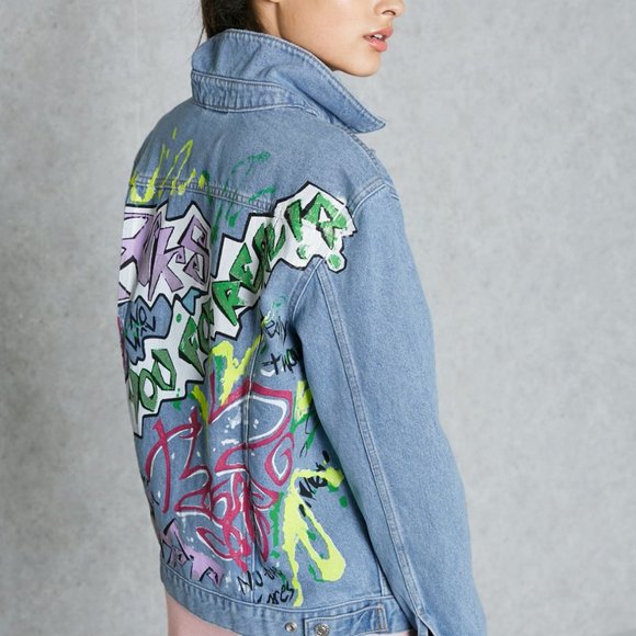 Topshop Moto Graffiti Denim Jacket. Lightwash with distress denim and graffiti on the back. Make a statement when you walk away! Features a front button closure, point collar, long sleeves with button covers, chest button flap pockets, side welt pockets, and adjustable hem snap tabs. White Area of paint is meant to look cracked as seen in photo.