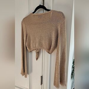 Stylish gold tie-front cardigan with long sleeves. Perfect for layering. cute crochet like detail on sleeves, there is a pull across the back, not super noticeable, guc