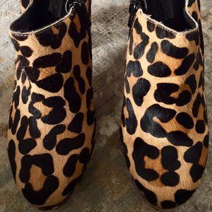 Camel, tan + black calf hair leopard print, with side zip closure. 4" heel, 1/2" Platform