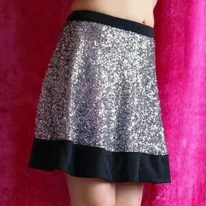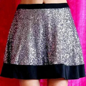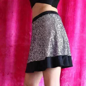 Designed with all-over glittery silver sequins, a satiny black waistband, and hem detailing, this skirt combines texture and metallic glam for a chic, festive vibe.