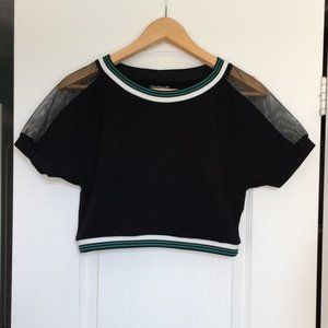 Topshop Black Mesh Shoulder Panel Sport Luxe Crop Top T-Shirt. Features green and white stripe contrast trim.