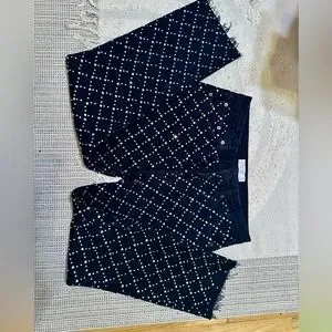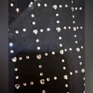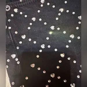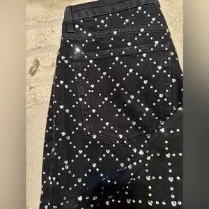 These jeans are seriously amazing. Unfortunately too big for me. Would work great for festivals! You’ré friends would always be able to spot you in the crowd. The rhinestones are so sparkly and every third one is a heart. Only been worn twice