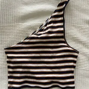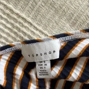 This stylish tank top from Topshop features an asymmetrical design with a single shoulder strap, offering a modern twist to your wardrobe. Crafted from ribbed fabric, it showcases a fun white, dark blue, and orange color scheme that adds a touch of playfulness. The form-fitting silhouette and cropped length make it a versatile piece for any occasion.