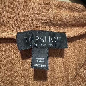 This elegant Topshop blouse showcases a ribbed texture, making it a stylish addition to any wardrobe. The tan hue and long sleeves provide versatility, ideal for layering or standalone wear. Crafted from soft material, it ensures comfort while maintaining a timeless appeal.
