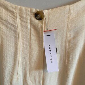 New with original tags.Wide leg, flowy fit. Thin, linen-like material in a warm cream/oatmeal colour with subtle crinkle texture. Pleats in front and back around waistband. Double button and zipper closure with visible brown tortoise shell button. Hidden pockets and one faux pocket on back right. High rise with cropped length.