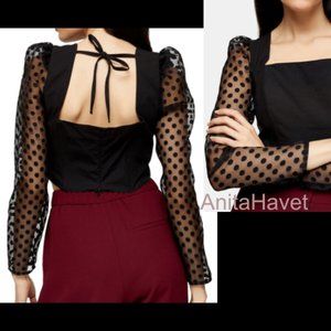 Dots spot the sheer leg-of-mutton sleeves of this cropped and seamed square-neck top.