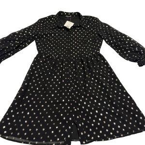 Topshop: Women's Gold Polka Dot Button-Up Midi Black Dress with Long Sleeves