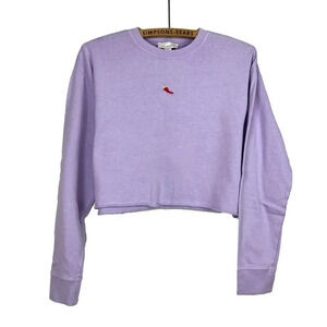 This Topshop cropped crewneck sweater in a vibrant purple features a playful embroidered hot pepper graphic on the front. With tags removed but never worn, this sweater is in excellent condition. Its cropped length and soft fabric make it perfect for casual, laid-back styling.
