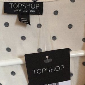 This is a brand new with tags Topshop brand blouse. It is off white in colour with black polka dots and black tie front closure. Only closure is the two front ties so it is partially open and perfect to wear over a tank or bandeau.