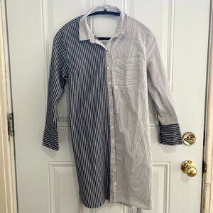 Shirtdress with a waist tie, contrasting blue/white stripe panels, and a cutout in the upper back. (Sixth photo is an attempt at showing what the cutout looks like!) Hits just above knee on me (5'5")