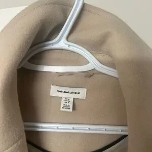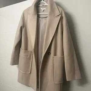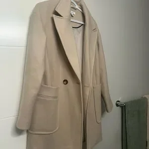 Chic and versatile tan pea coat. Features large pockets and a single button closure. Ideal for layering.
