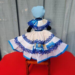 Vintage topsy turvy doll. Measures 12 1/2 inches from top of head to top of head. Bright cheerful colours. Tiny pull in lower white fabric of skirt but minimal and doesn't distract. This doll is more of a collectible for display or for an older child and not meant for a young child.