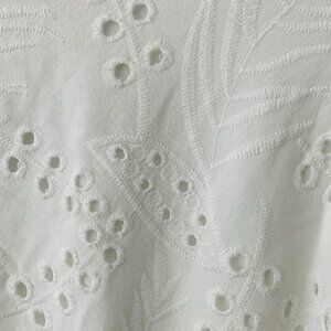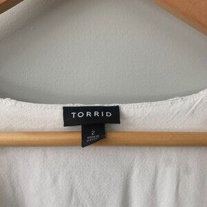 White Torid V neck with slight taper at the waist, eyelet material with underlining. Summer blouse, spring top, great with jeans or skirt. Casual wear.