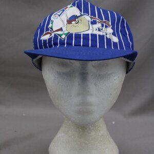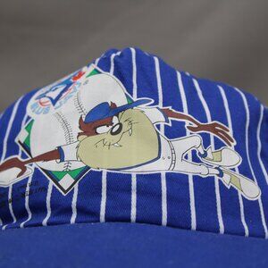 Up for sale is a vintage Toronto Blue Jays hat. It has a blue base colour with white pin stripes screened on. The front of the hat has a graphic of Taz stealing a base with the Blue Jays logo above. What a great vintage hat do not miss out on it.