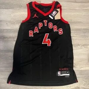 Toronto Raptors basketball jersey in black with red accents. Features #4 Scottie Barnes and team logo.