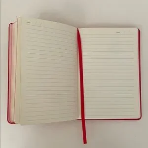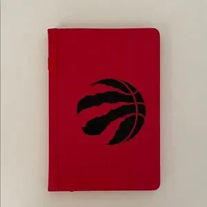 Leather-bound red Toronto Raptors notebook with lined pages, elastic pen loop, and ribbon bookmark
