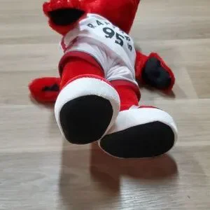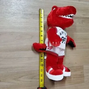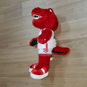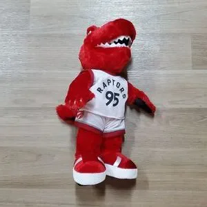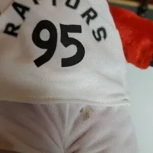 Red Raptors plush toy with white jersey. Features number 95. It stands approximately 13½" inches tall. There is a very small (1 cm X 1 cm) pop, coffee or chocolate milk stain on the pants, hidden by the shirt; otherwise it is in mint condition.