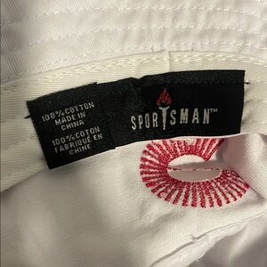 Stylish white bucket hat featuring a red logo. Perfect for casual outings.