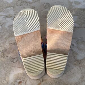 Absolutely delightful original Torpatoffeln Swedish clogs. These are their Cape Clogs, featuring a heavy coated canvas upper with a bold and colourful floral print, very 60s!