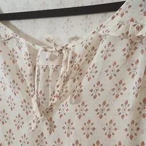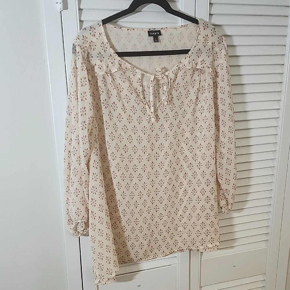 Stylish cream blouse with brown patterns. Features a tie-front detail and long sleeves.